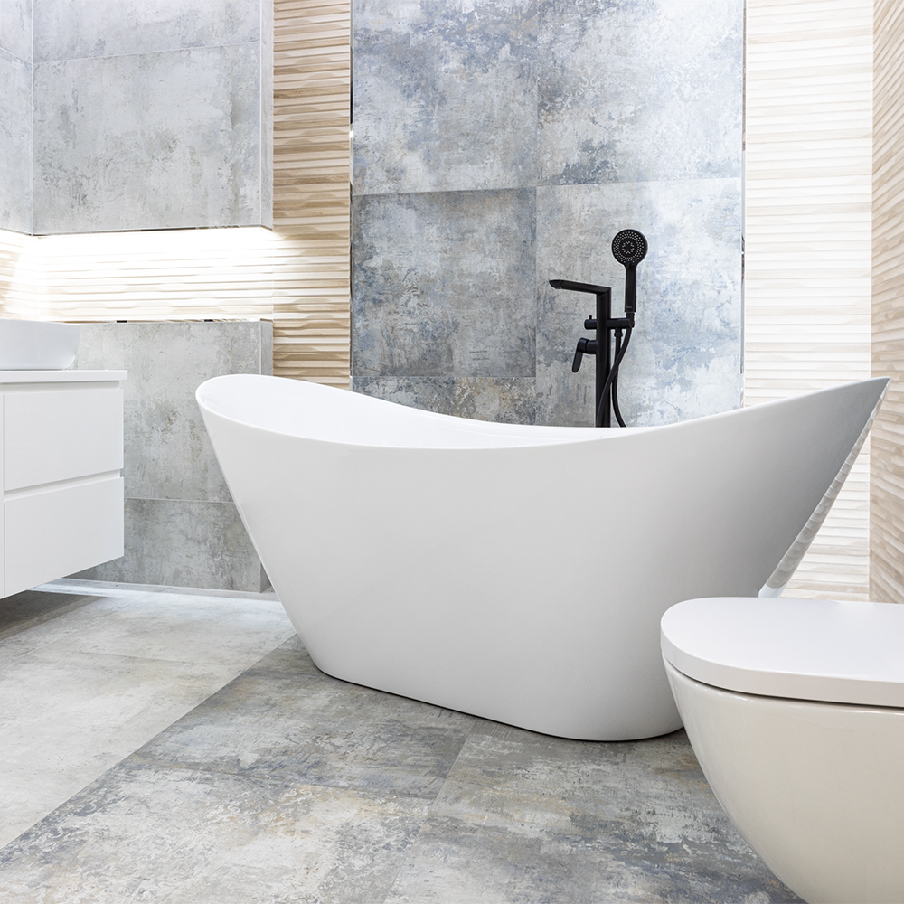 Voľne stojaca akrylátová vaňa s prepadom, odtok v strede, súčasťou je vaňová odtoková súprava, click/clack výpusť vo farbe chróm