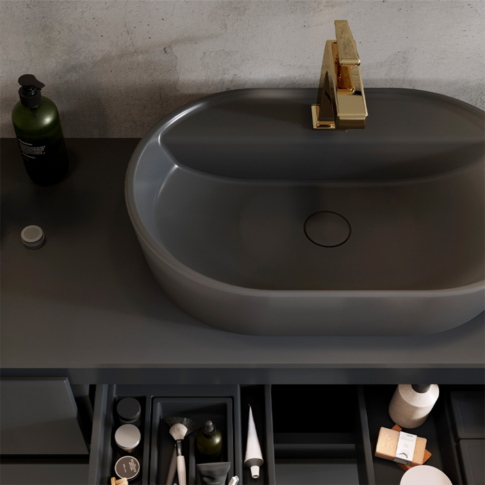 Materiál: keramika Povrchová úprava: bez povrchovej úpravy Povrch: matný Tvar: oválne Prepad: bez prepadu Farba: antracit Výška: 13 cm Otvor pre batériu: s otvorom pre batériu Rozmer umývadlá: 62 x 41 cm